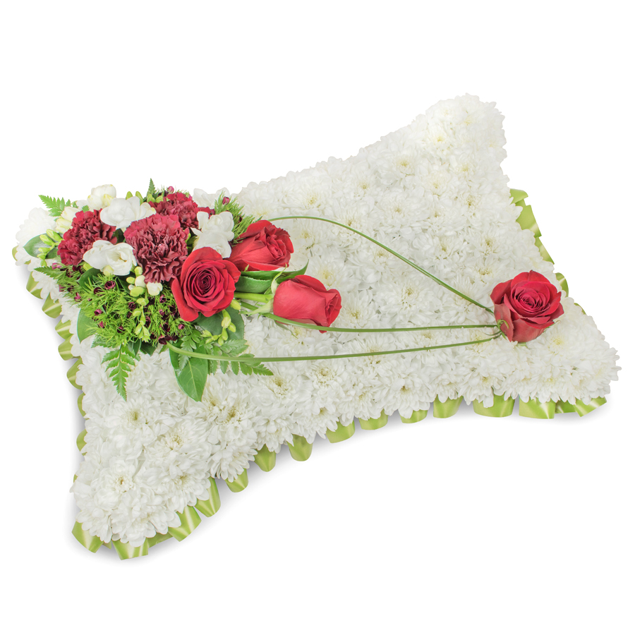 Convey your heartfelt condolences with our gracefully designed sympathy bouquet, combining white chrysanthemums, vivid red roses, sweet white freesias, dark red carnations, delicate dianthus, and bear grass for a touching tribute.